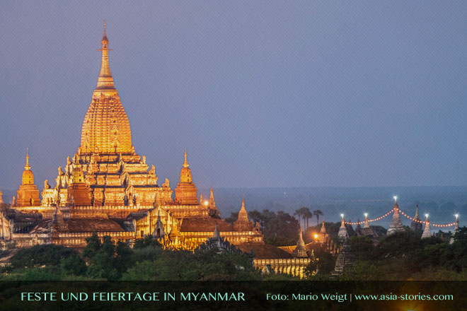 Das Ananda-Pagoden-Fest zählt zu den wichtigsten Events in Bagan. Die Ananda-Pagode gilt als die größte und schönste Pagode in der Tempelebene. Am Tag des Vollmondes pilgern tausende Burmesen in das Heiligtum. Hunderte Marktstände bieten vorwiegend chinesische aber auch lokale Waren an, traditionelle Tänze werden aufgeführt, Theaterstücke gezeigt, geschlemmt und gesungen. Auf dem Fest kann man die gesamte myanmarische Küche durchprobieren. Hintergrund des Festes ist die Ehrung der Weisheit Buddhas.