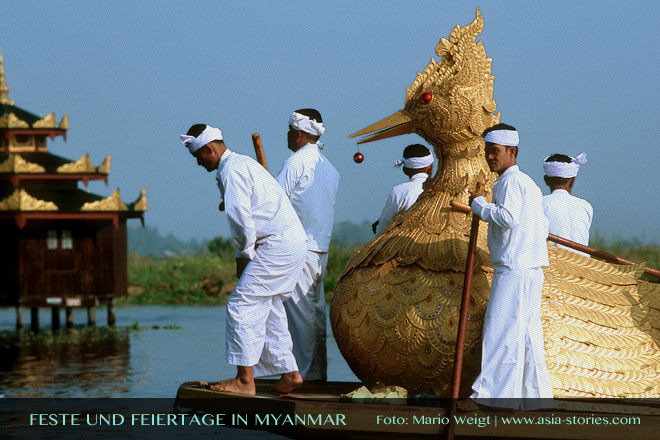 Alljährlich im September oder Oktober – abhängig vom buddhistischen Mondkalender – findet auf dem Inle-See in Myanmar das größte und bunteste Festival der südlichen Shan Provinz statt. Dann ist das ganze Volk der Intha auf den Beinen bzw. an den Rudern. Tausende Pilger strömen aus Myanmar in die Ortschaft Nyaungshwe und versetzen den sonst so ruhigen Inle-See für drei Wochen in den Ausnahmezustand.