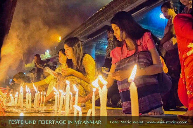 Das Lichterfest (Thadingyut) wird überall in Myanmar gefeiert. Das Fest startet einen Tag vor Vollmond und endet zwei Tage danach. Gebäude und Strassen werden mit Kerzen und Lampen illuminiert und in den Pagoden herrscht besonders am Vollmondtag großer Andrang.