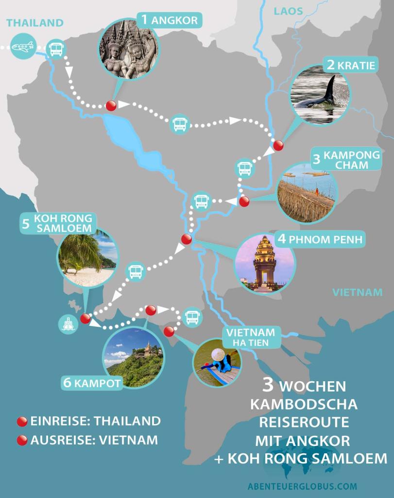 Unser optimierter Routenvorschlag der » 3 Wochen Kambodscha Rundreise mit Angkor / Siem Reap und Koh Rong Samloem ist ideal für alle Reisende, die von Thailand Kambodscha 3 Wochen besuchen möchten und zum Schluss nach Vietnam weiterreisen.
