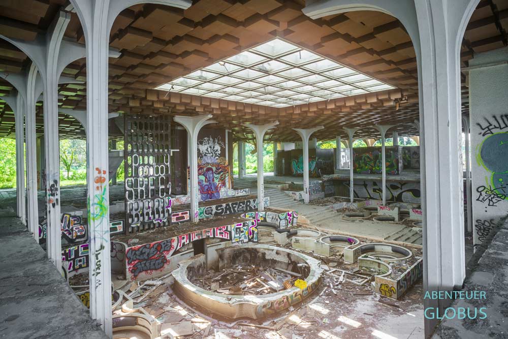 Das Ziel und unser Highlight der Tour war die Erkundung des verlassenen Haludovo Palace Hotels, eines der spannendsten Lost Places Kroatiens. Die Zeitreise in das vergangene Jugoslawien beginnt schon weiter unten am Strand von Malinska. Massive Uferbefestigungen mit halbrundem Betonsichtschutz für die Privatsphäre sonnenhungriger Badegäste prägen den Uferabschnitt unter dem ehemaligen Hotelkomplex Haludovo (» Google Maps). Von der Meeresseite führt ein Trampelpfad bergauf durch dichtes Buschwerk, vorbei an verfallenen Bungalows und Aussichtsplattformen. Oben angekommen, steht man vor einer Poollandschaft aus geschwungenen Becken in Hellblau, leider ohne Wasser, dafür alle Wände von Sprayern dekoriert. Herzstück des Prachtbaus war aber der Spielsalon mit wohl 70 angestellten Hostessen, die sich um die zahlungskräftigen Gäste kümmerten.