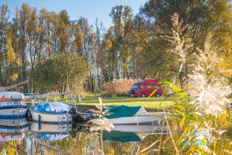 Wer frühmorgens den Abflug der Wildgänse und Kraniche beobachten möchte, sollte in Linum übernachten. Auf dem kleinen Wohnmobilstellplatz vom Teichland Linum (» Google Maps) direkt am Hafen finden ca. 10 Wohnmobile, Camper oder Bullis ausreichend Platz. Für die Camper stehen zwei Toiletten und je eine Dusche in der Fischerhütte zur Verfügung. Vom Stellplatz ist es nur ein kurzer Weg zu den Linumer Teichen. Die Anmeldung erfolgt im Imbiss Fischerhütte, dort wird auch die Stellplatzgebühr entrichtet. Reservierungen sind nicht möglich. Nach dem Motto: Der frühe Vogel fängt den Wurm!