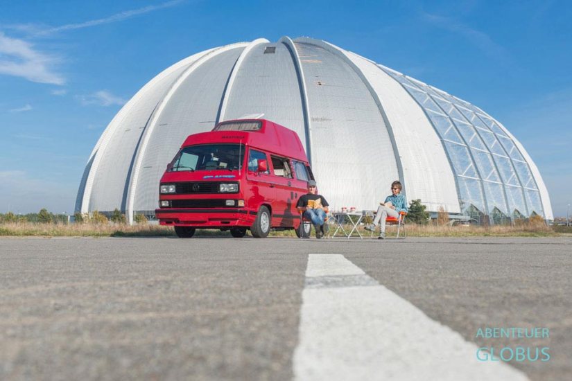 Na ja, nun kann man natürlich in dem südlich gelegenen „Campingplatz Tropical Islands“ sein Lager auf einem der 92 Stellplätze aufschlagen und alle erdenklichen Annehmlichkeiten, wie Sani, Strom, Hecken, Tennisrasen und Shuttlebus genießen oder in greifbarer Nähe zum Tropenparadies einen Stellplatz auf der Start- und Landebahn des ehemaligen Flughafens nehmen. Wozu haben wir einen Bulli mit allen Annehmlichkeiten, um weitestgehend autark stehen zu können? Genau! Deshalb haben wir uns für die betonierte Landebahn entschlossen. Bei 24 Stunden für einen Fünfer und freie Platzwahl gibt es echt nichts zu meckern.