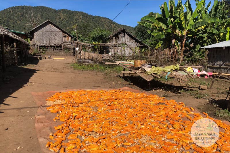 Für eine weitere Tour haben wir ein Auto mit Fahrer von Victoria (Aye Thiri Zaw) im ⇒ Souvenir- und Traveltour-Shop gechartert. Von Loikaw führt die Fahrt via Demoso in Richtung Südosten. Sanfte Hügellandschaft begleitet uns, hohe Berge in der Ferne, schöne Ausblicke ins Tal. Auf den Feldern ernten Bauern Hirse und Mais. Nach 60 Kilometer heißt uns ein blaues Betonschild mit der Aufschrift Daw Ta Ma Gyi (sprich Do Ta Ma Dschie, GPS: 19°19’22″N 97°21’31″E) willkommen. Erst 2014 wurde das Dorf für westliche Touristen geöffnet. Die 2.500 Einwohner gehören zur Volksgruppe der Kayah (Karenni, Rote Karen) und leben in 405 Pfahlhäusern.