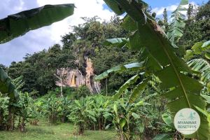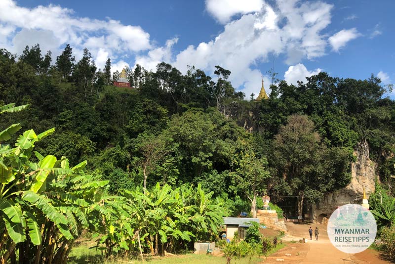 Anfahrt: Über Demoso, Abzweig rechts nach Pan Pet (GPS: 19°33’12″N 97°09’38″E) und gleich nach einem Kilometer wieder nach rechts (GPS: 19°33’04″N 97°09’05″E) abbiegen. Weiter auf der Straße in Richtung Pekon ca. 14 Kilometer bis zum Dorf Oh Kho. Am Tempeltor und seitlichen grün-weißen Schild (nur burmesisch, GPS: 19°39’40.5″N 97°06’39.7″E) links ab, ein Kilometer weiter und dann beginnt der Aufstieg.