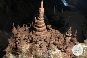 Ebenfalls nördlich von Loikaw inmitten von Ackerland steht ein bewachsener Karsthügel mit Gold-Stupa on top und stehenden Buddha am Hang. In dem befindet sich die 300 Meter lange Höhle Aung Tha Pyae (GPS: 19°46’44.5″N 97°13’22″E). Den Eingang wird von einer Buddha-Statue mit Naga und Stupa flankiert. Gleich in der ersten Halle mit den meisten Buddhas haltet euch rechts, so gelangt ihr über einen Weg und mehreren Stufen in weitere Höhlenkammern mit Stalaktiten, Stalagmiten und vereinzelten Buddha-Figuren. Aus Lehm geformte Mini-Pagoden sind das Werk von burmesischen Gläubigen. Am Ende, wie kann es anders sein, steht eine goldene Pagode. Die Höhle ist beleuchtet, parken könnt ihr links am Verkaufsstand (Getränke und Snacks). Achtung: Die zutraulichen Hunde der Mönche sind verrückt nach Keksen. 😉