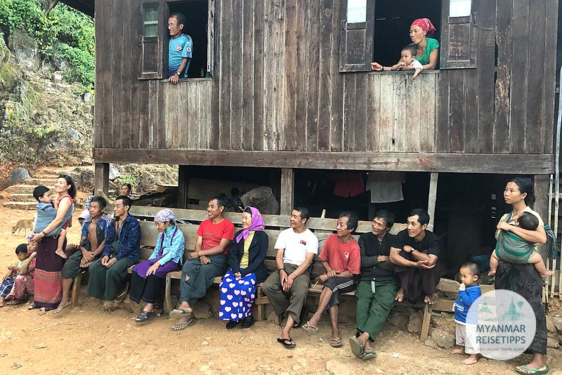 Vor Htay Kho treffen wir Kayaw-Frauen mit Kiepen voller Feuerholz, eine ältere nehmen wir in unserem Auto zum Dorf mit. Htay Kho liegt auf 1.733 Meter über den Meeresspiegel. In 100 Häusern leben ungefähr 300 Kayaw, die sich auch als Karen bezeichnen. Ihre eigene Sprache gehört zur sino-tibetischen Sprachfamilie. Tamo Bana bedeutet hallo, Bana danke und Agrah schön.